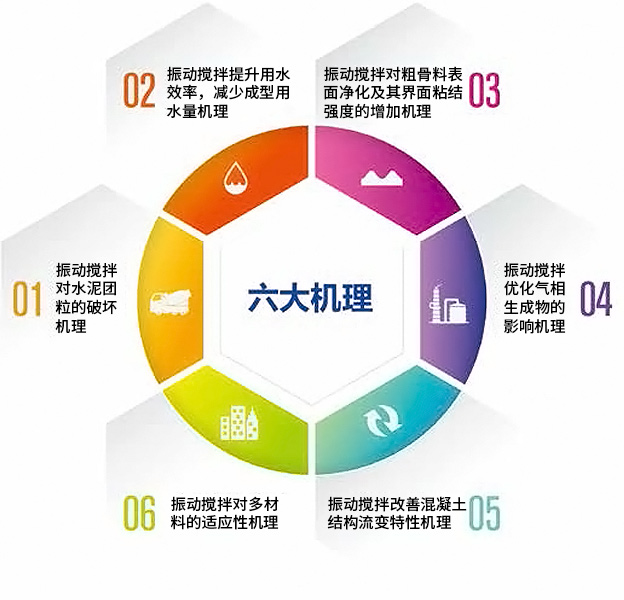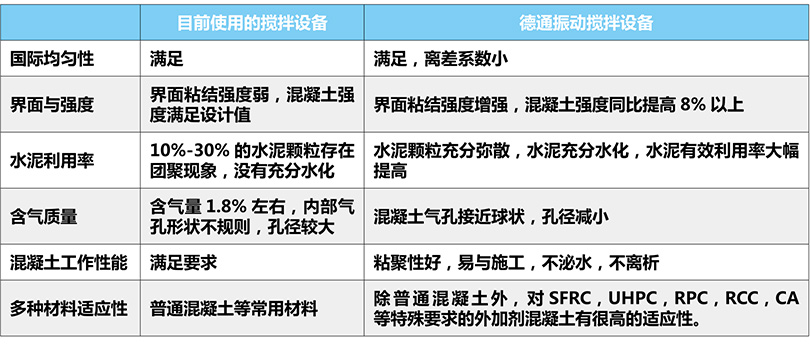 試驗數(shù)據(jù)表明:在同等條件下,振動攪拌與傳統(tǒng)的強(qiáng)制式攪拌相比,當(dāng)水泥用量不變時,混凝土強(qiáng)度提高8%以上;當(dāng)混凝土強(qiáng)度不變時,大約可節(jié)約水泥5%~25%;攪拌時間可縮短20%以上,節(jié)能約30%。振動攪拌從微觀上改善了混合料的固液氣 3 相結(jié)構(gòu),提高了混凝土性能 。