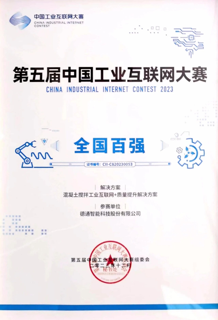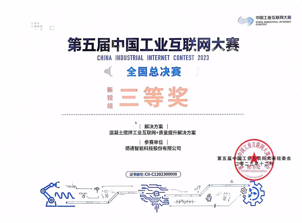 12月22日,由國(guó)家工業(yè)和信息化部主辦的第五屆中國(guó)工業(yè)互聯(lián)網(wǎng)大賽在浙江寧波圓滿閉幕,德通智能科技股份有限公司的參賽項(xiàng)目《混凝土攪拌工業(yè)互聯(lián)網(wǎng)+質(zhì)量提升解決方案》一路過(guò)關(guān)斬將闖進(jìn)總決賽,最終以第8名的成績(jī)奪得新銳組三等獎(jiǎng)。
