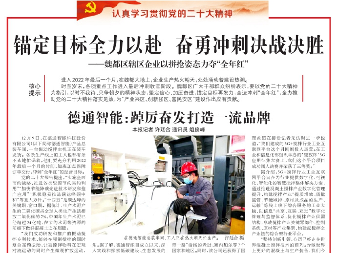 12月9日,在德通智能科技股份有限公司(以下簡稱德通智能)產(chǎn)品總裝車間,一臺振動攪拌主機(jī)正在裝車發(fā)貨。