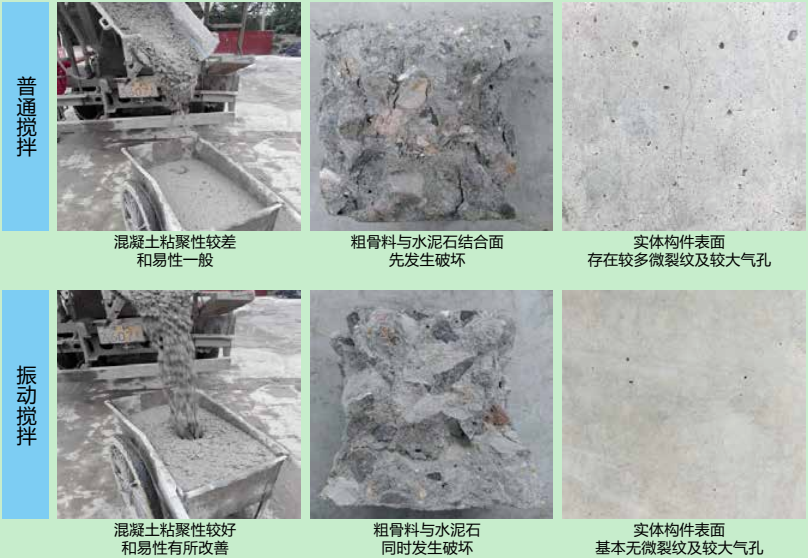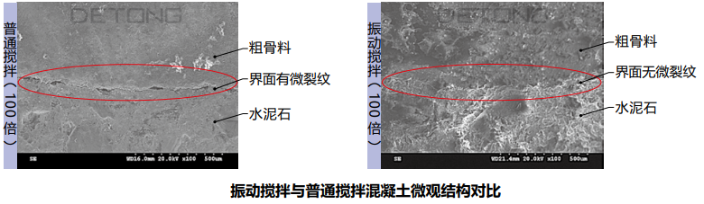 普通攪拌時,由于微觀均勻性不足,粗骨料和水泥石的界面處是薄弱環(huán)節(jié),經常存在微裂紋,影響宏觀力學性能和耐久性;振動攪拌時,粗骨料和水泥膠漿間的相互高頻顫振強化了二者的界面,硬化后粗骨料和水泥石的界面處無微裂紋,宏觀力學性能和耐久性得到提升。