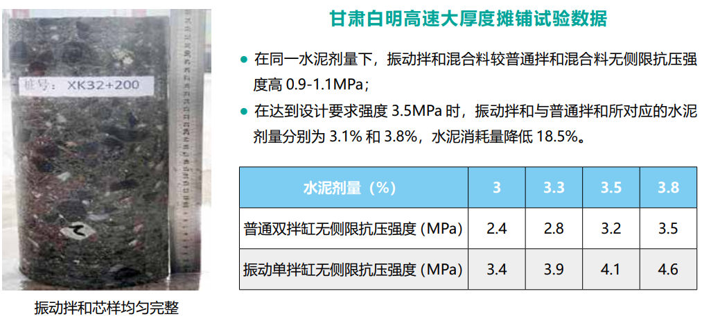 混合料在振動攪拌作用下充分攪拌均勻,相同配合比下強度可提高 20% ~ 100%,科學減少水泥用量,減少半剛性基層裂縫發(fā)生。